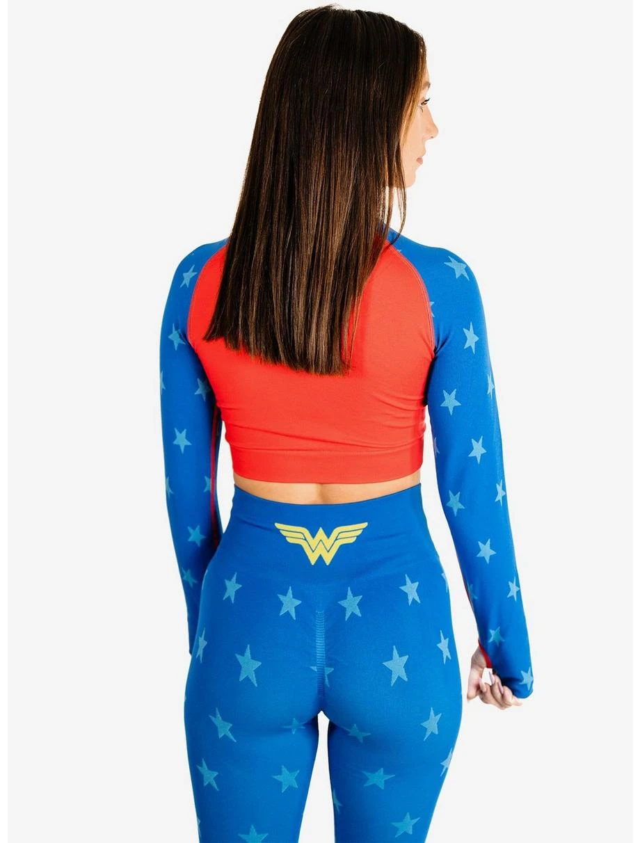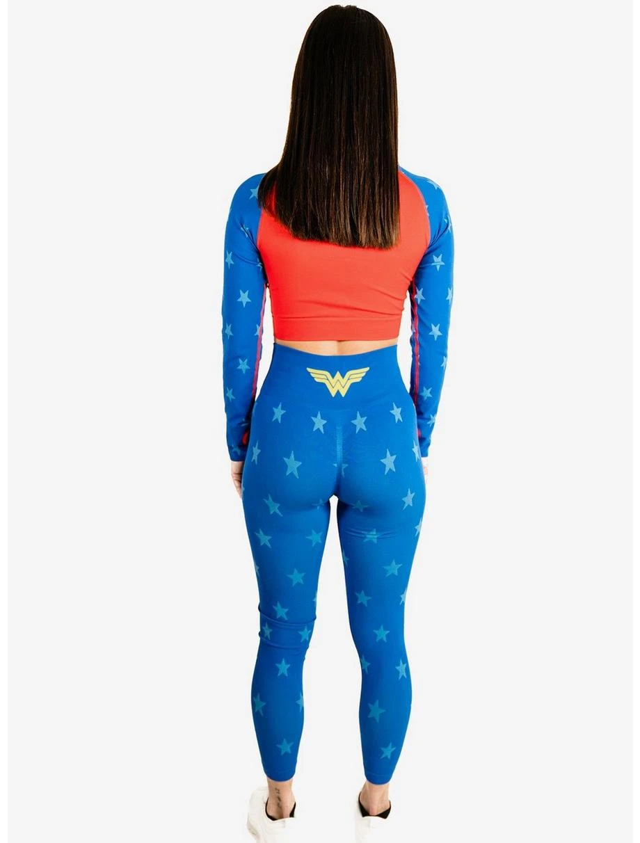 Embrace your inner superhero in this stylish Wonder Woman cosplay workout set! Join the strong and courageous Amazon warrior on her next mission as she fights for peace and teams up with other Justice League heroes like Batman, Superman, Flash, Green Lantern, and Aquaman to save the world. Wear the iconic Wonder Woman symbol proudly and enter the exciting world of DC Comics in your new seamless leggings and crop top designed to look like your favorite comic book character’s crime fighting costume.